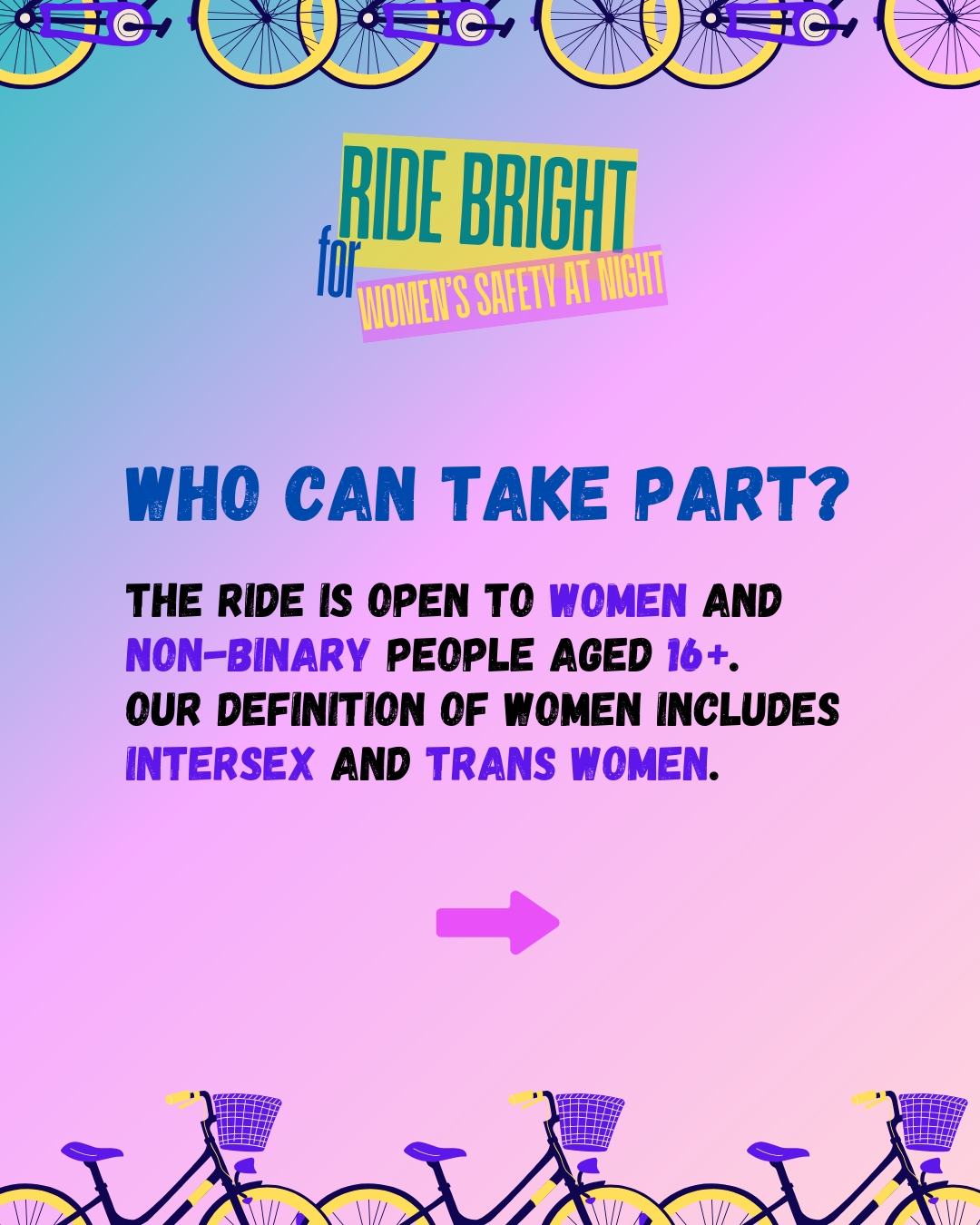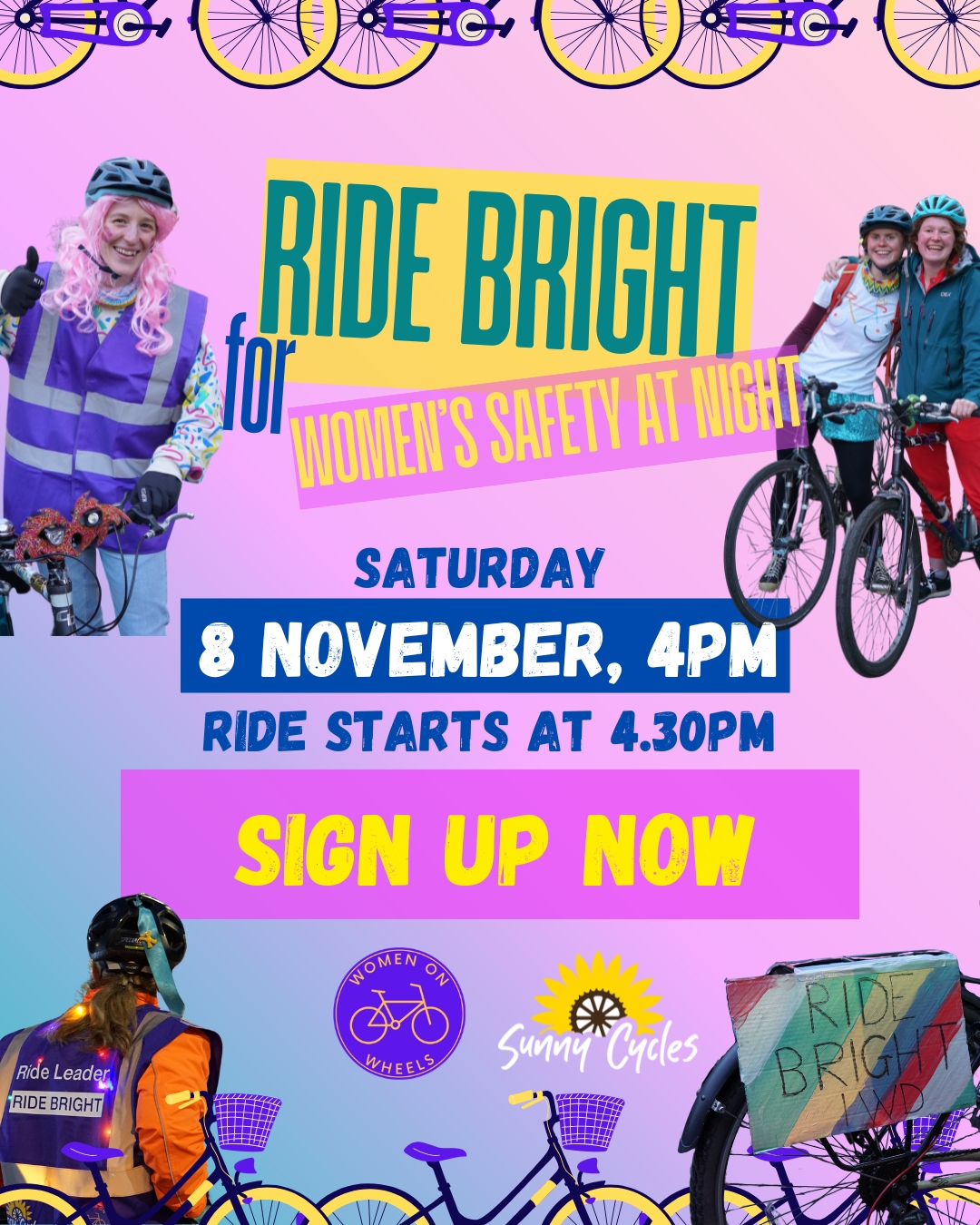 After last year’s hugely successful Ride Bright, we’re back with the second edition of our community night ride for women’s safety at night.